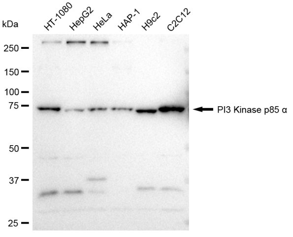 Western blotting analysis using PI3 Kinase p85 alpha antibody. Total cell lysates (30 μg) from various cell lines were loaded and separated by SDS-PAGE. The blot was incubated with PI3 Kinase p85 alpha antibody and HRP-conjugated goat anti-rabbit secondary antibody respectively.