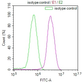 Overlay Peak curve showing MCF7 cells stained with CSB-RA921617A0HU (red line) at 1:100. The cells were fixed in 4% formaldehyde and permeated by 0.2% TritonX-100. Then 10% normal goat serum to block non-specific protein-protein interactions followed by the antibody (1ug/1*106cells) for 45min at 4℃. The secondary antibody used was FITC-conjugated Goat Anti-rabbit IgG(H+L) at 1:200 dilution for 35min at 4℃.Control antibody (green line) was rabbit IgG (1ug/1*106cells) used under the same conditions. Acquisition of >10,000 events was performed.