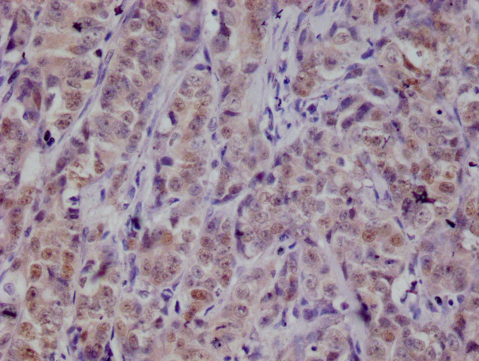IHC image of CSB-RA921617A0HU diluted at 1:100 and staining in paraffin-embedded human colon cancer performed on a Leica BondTM system. After dewaxing and hydration, antigen retrieval was mediated by high pressure in a citrate buffer (pH 6.0). Section was blocked with 10% normal goat serum 30min at RT. Then primary antibody (1% BSA) was incubated at 4°C overnight. The primary is detected by a Goat anti-rabbit polymer IgG labeled by HRP and visualized using 0.05% DAB.