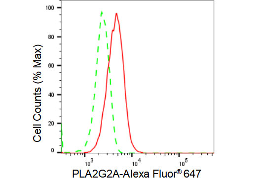 Flow cytometric analysis of PLA2G2A expression in HepG2 cells using PLA2G2A antibody. Green, isotype control; red, PLA2G2A.