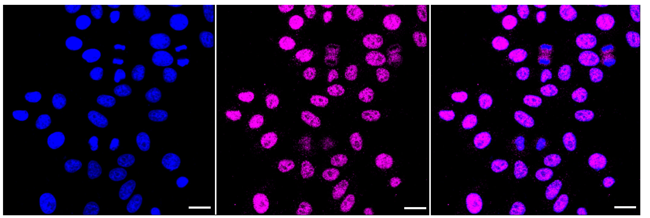 Immunocytochemical staining of HepG2 cells with PLA2G2A antibody. Nuclei were stained blue with DAPI; PLA2G2A was stained magenta with Alexa Fluor? 647. Images were taken using Leica stellaris 5. Protein abundance based on laser Intensity and smart gain: Medium. Scale bar: 20 μm.