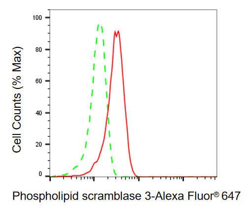 Flow cytometric analysis of phospholipid scramblase 3 expression in H9c2 cells using phospholipid scramblase 3 antibody. Green, isotype control; red, phospholipid scramblase 3.