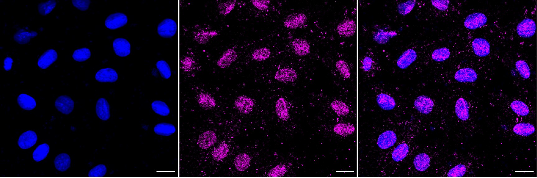 Immunocytochemical staining of H9c2 cells with Phospholipid scramblase 3 antibody. Nuclei were stained blue with DAPI;Phospholipid scramblase 3 was stained magenta with Alexa Fluor? 647. Images were taken using Leica stellaris 5. Protein abundance based on laser Intensity and smart gain: Medium. Scale bar, 20 μm.
