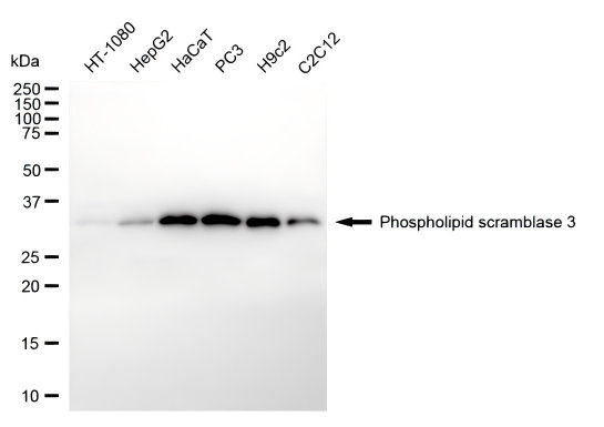 Western blotting analysis using phospholipid scramblase 3 antibody. Total cell lysates (20 μg for H9c2 and C2C12, 30 μg for others ) from various cell lines were loaded and separated by SDS-PAGE. The blot was incubated with phospholipid scramblase 3 antibody and HRP-conjugated goat anti-rabbit secondary antibody respectively.