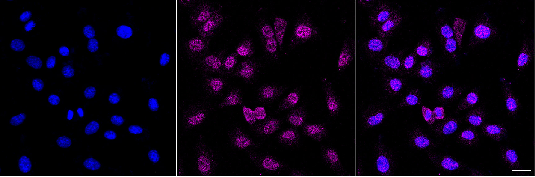 Immunocytochemical staining of C2C12 cells with DNA polymerase beta antibody. Nuclei were stained blue with DAPI; DNA polymerase beta was stained magenta with Alexa Fluor? 647. Images were taken using Leica stellaris 5. Protein abundance based on laser Intensity and Smart Gain: Low. Scale bar, 20 μm.
