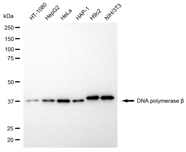 Western blotting analysis using DNA polymerase beta antibody. Total cell lysates (30 μg) from various cell lines were loaded and separated by SDS-PAGE. The blot was incubated with DNA polymerase beta antibody and HRP-conjugated goat anti-rabbit secondary antibody respectively.