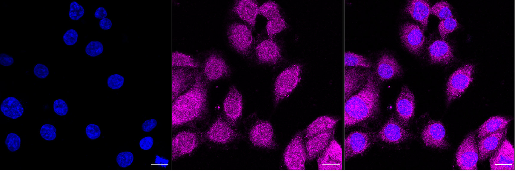 Immunocytochemical staining of HT-1080 cells with pyrophosphatase 1 antibody. Nuclei were stained blue with DAPI; Pyrophosphatase 1 was stained magenta with Alexa Fluor? 647. Images were taken using Leica stellaris 5. Protein abundance based on laser Intensity and smart gain: Medium. Scale bar, 20 μm.