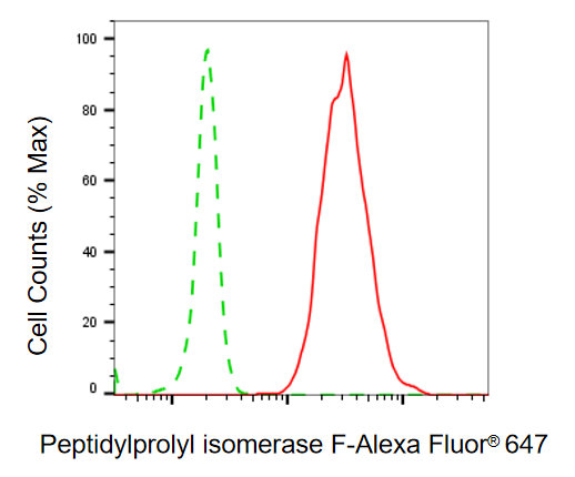 Flow cytometric analysis of peptidylprolyl isomerase F expression in C2C12 cells using peptidylprolyl isomerase F antibody. Green, isotype control; red, peptidylprolyl isomerase F.