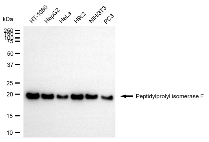 Western blotting analysis using peptidylprolyl isomerase F antibody. Total cell lysates (30 μg) from various cell lines were loaded and separated by SDS-PAGE. The blot was incubated with peptidylprolyl isomerase F antibody and HRP-conjugated goat anti-rabbit secondary antibody respectively.