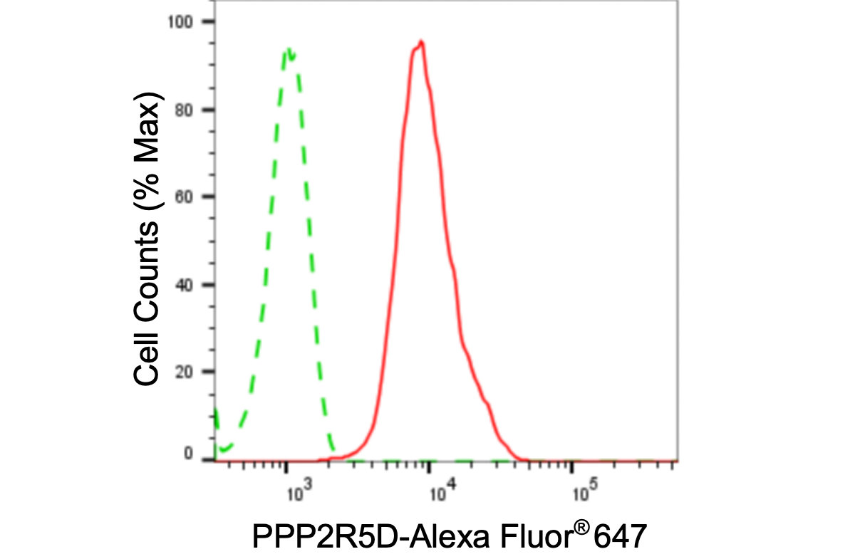 Flow cytometric analysis of PPP2R5D expression in HepG2 cells using PPP2R5D antibody. Green, isotype control; red, PPP2R5D.