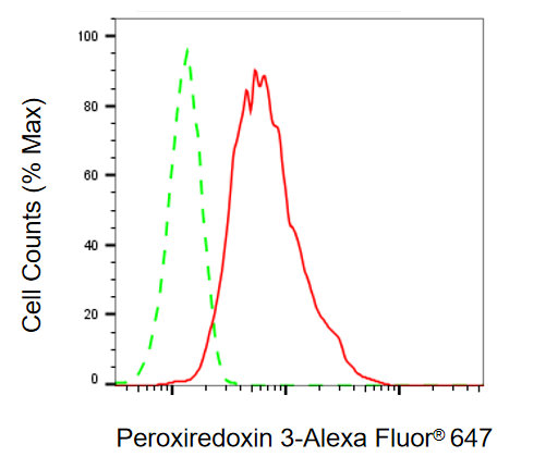 Flow cytometric analysis of peroxiredoxin 3 expression in HeLa cells using peroxiredoxin 3 antibody. Green, isotype control; red, peroxiredoxin 3.