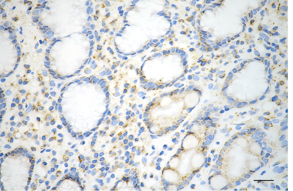 Immunohistochemistry was performed on paraffin-embedded human gastric carcinoma using peroxiredoxin 3 antibody. Antigen retrieval was done in sodium citrate buffer (pH 6.0). DAB was used for detection, with hematoxylin counterstaining. Images were acquired using a Nikon Ci-L Plus microscope (40× objective). Scale bar: 25 μm.