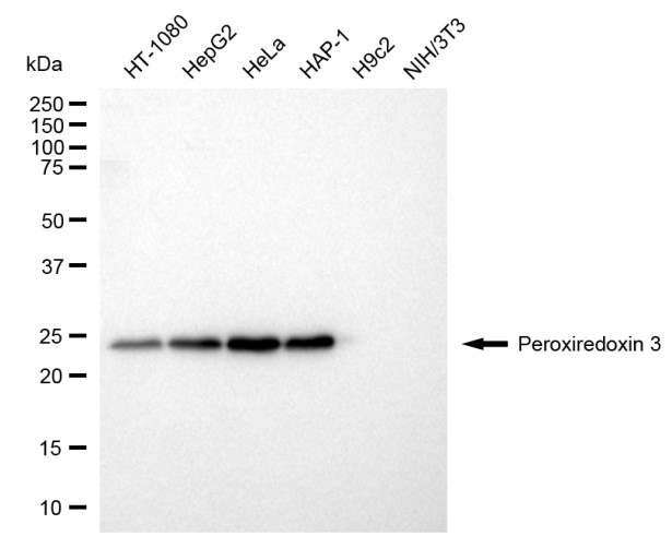 Western blotting analysis using peroxiredoxin 3 antibody. Total cell lysates (30 μg) from various cell lines were loaded and separated by SDS-PAGE. The blot was incubated with peroxiredoxin 3 antibody and HRP-conjugated goat anti-rabbit secondary antibody respectively.