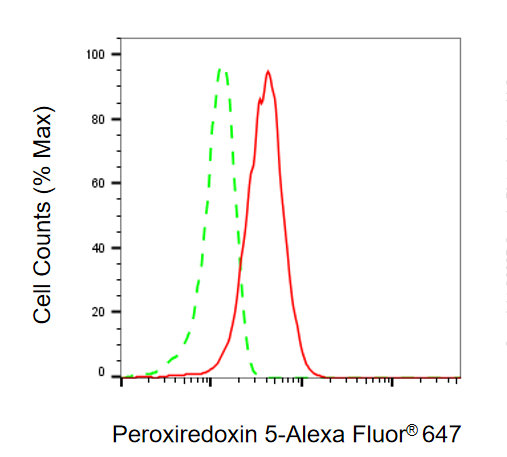 Flow cytometric analysis of Peroxiredoxin 5 expression in H9c2 cells using Peroxiredoxin 5 antibody. Green, isotype control; red, Peroxiredoxin 5.