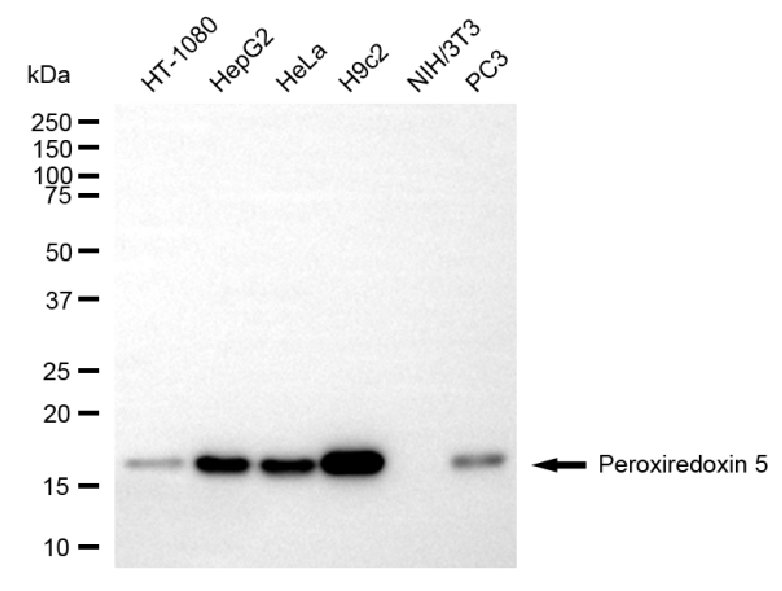 Western blotting analysis using peroxiredoxin 5 antibody. Total cell lysates (30 μg) from various cell lines were loaded and separated by SDS-PAGE. The blot was incubated with peroxiredoxin 5 antibody and HRP-conjugated goat anti-rabbit secondary antibody respectively.