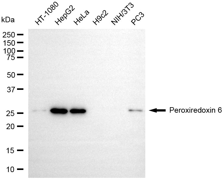 Western blotting analysis using peroxiredoxin 6 antibody. Total cell lysates (30 μg) from various cell lines were loaded and separated by SDS-PAGE. The blot was incubated with peroxiredoxin 6 antibody and HRP-conjugated goat anti-rabbit secondary antibody respectively.