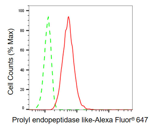 Flow cytometric analysis of prolyl endopeptidase like expression in H9c2 cells using prolyl endopeptidase like antibody. Green, isotype control; red, prolyl endopeptidase like.