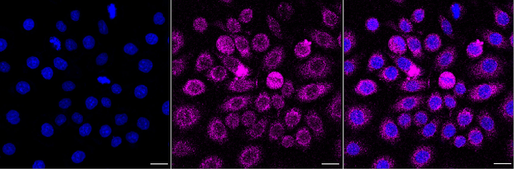 Immunocytochemical staining of HeLa cells with Prolyl endopeptidase like antibody. Nuclei were stained blue with DAPI; Prolyl endopeptidase like was stained magenta with Alexa Fluor? 647. Images were taken using Leica stellaris 5. Protein abundance based on laser Intensity and smart gain: Medium. Scale bar, 20 μm.