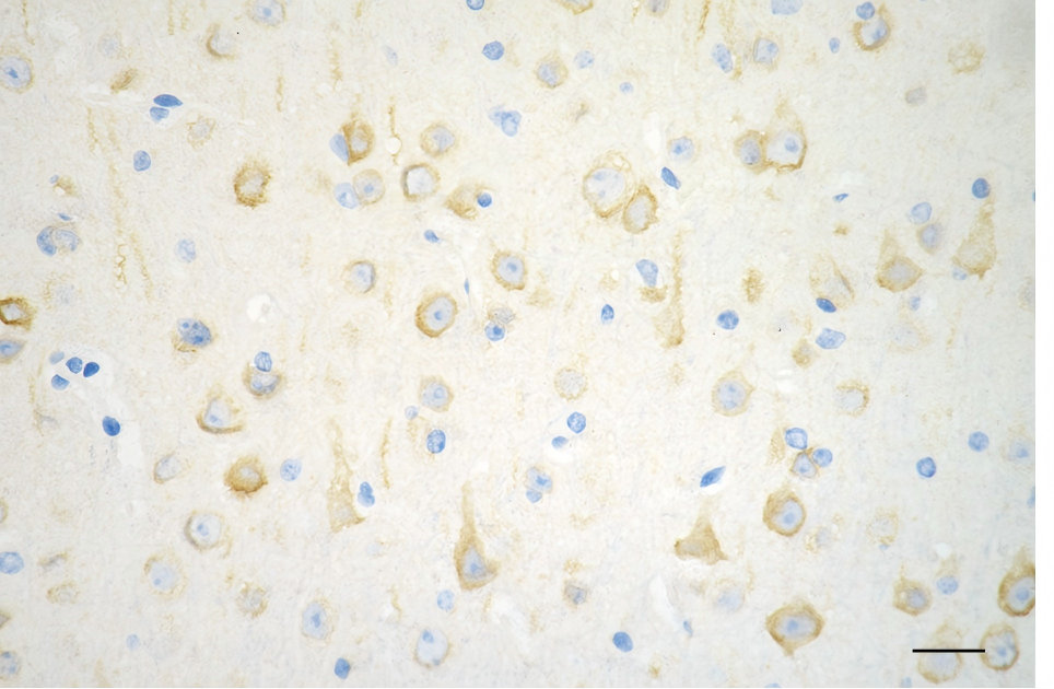 Immunohistochemistry was performed on paraffin-embedded mouse brain using prolyl endopeptidase like antibody. Antigen retrieval was done in sodium citrate buffer (pH 6.0). DAB was used for detection, with hematoxylin counterstaining. Images were acquired using a Nikon Ci-L Plus microscope (40× objective). Scale bar: 25 μm.