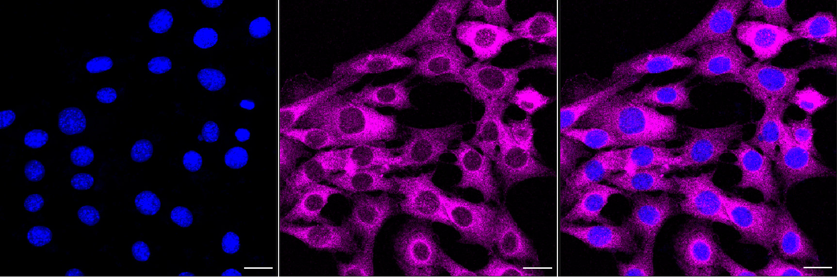 Immunocytochemical staining of C2C12 cells with phospho-PKC alpha (T497) antibody. Nuclei were stained blue with DAPI; Phospho-PKC alpha (T497) was stained magenta with Alexa Fluor? 647. Images were taken using Leica stellaris 5. Protein abundance based on laser Intensity and smart gain: Medium. Scale bar, 20 μm.