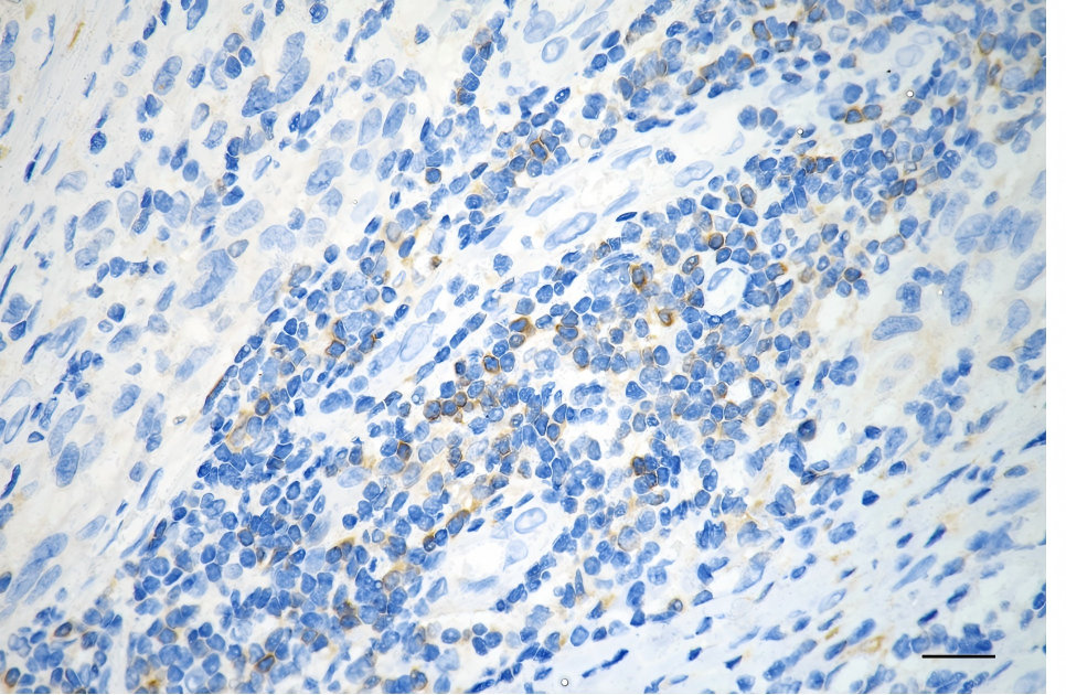 Immunohistochemistry was performed on paraffin-embedded human melanoma using phospho-PKC alpha (T497) antibody. Antigen retrieval was done in sodium citrate buffer (pH 6.0). DAB was used for detection, with hematoxylin counterstaining. Images were acquired using a Nikon Ci-L Plus microscope (40× objective). Scale bar: 25 μm.