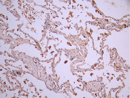 IHC image of CSB-RA057607A0HU diluted at 1:100 and staining in paraffin-embedded human lung tissue performed on a Leica BondTM system. After dewaxing and hydration, antigen retrieval was mediated by high pressure in a citrate buffer (pH 6.0). Section was blocked with 10% normal goat serum 30min at RT. Then primary antibody (1% BSA) was incubated at 4°C overnight. The primary is detected by a Goat anti-rabbit polymer IgG labeled by HRP and visualized using 0.05% DAB.