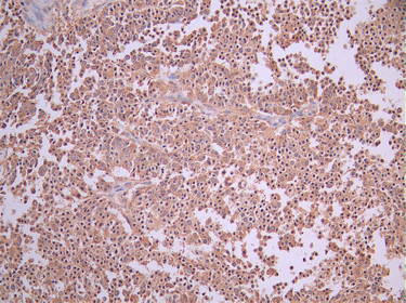 IHC image of CSB-RA057607A0HU diluted at 1:100 and staining in paraffin-embedded human liver cancer performed on a Leica BondTM system. After dewaxing and hydration, antigen retrieval was mediated by high pressure in a citrate buffer (pH 6.0). Section was blocked with 10% normal goat serum 30min at RT. Then primary antibody (1% BSA) was incubated at 4°C overnight. The primary is detected by a Goat anti-rabbit polymer IgG labeled by HRP and visualized using 0.05% DAB.