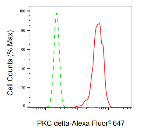 Flow cytometric analysis of PKC delta expression in HT-1080 cells using PKC delta antibody. Green, isotype control; red, PKC delta.