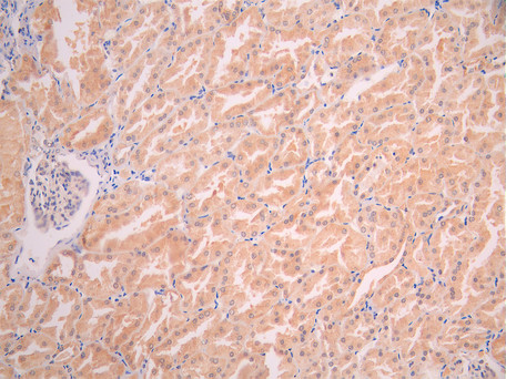 IHC image of CSB-RA584389A0HU diluted at 1:100 and staining in paraffin-embedded human kidney tissue performed on a Leica BondTM system. After dewaxing and hydration, antigen retrieval was mediated by high pressure in a citrate buffer (pH 6.0). Section was blocked with 10% normal goat serum 30min at RT. Then primary antibody (1% BSA) was incubated at 4°C overnight. The primary is detected by a Goat anti-rabbit polymer IgG labeled by HRP and visualized using 0.05% DAB.