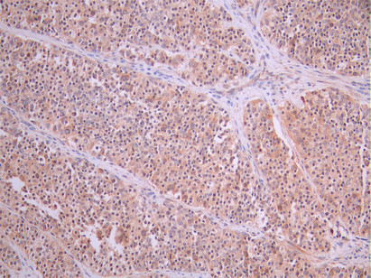 IHC image of CSB-RA584389A0HU diluted at 1:100 and staining in paraffin-embedded human liver cancer performed on a Leica BondTM system. After dewaxing and hydration, antigen retrieval was mediated by high pressure in a citrate buffer (pH 6.0). Section was blocked with 10% normal goat serum 30min at RT. Then primary antibody (1% BSA) was incubated at 4°C overnight. The primary is detected by a Goat anti-rabbit polymer IgG labeled by HRP and visualized using 0.05% DAB.