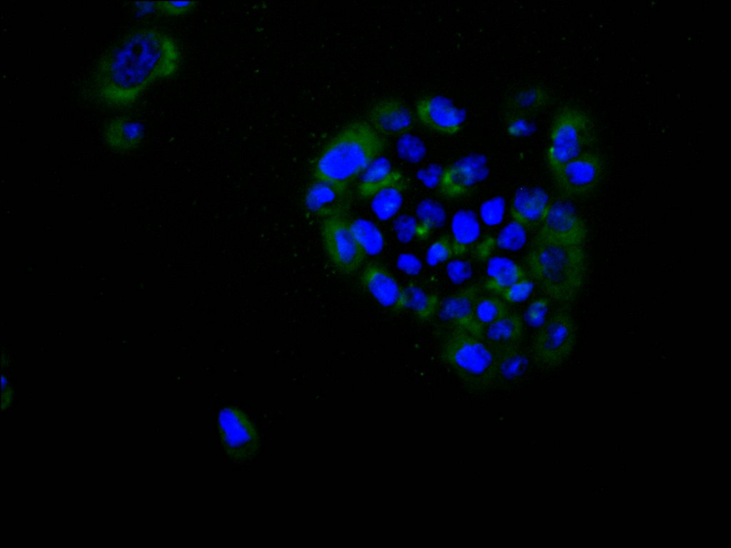 Immunofluorescence staining of A431 cell with CSB-RA789546A0HU at 1:50, counter-stained with DAPI. The cells were fixed in 4% formaldehyde and blocked in 10% normal Goat Serum. The cells were then incubated with the antibody overnight at 4°C. The secondary antibody was Alexa Fluor 488-congugated AffiniPure Goat Anti-Rabbit IgG(H+L).