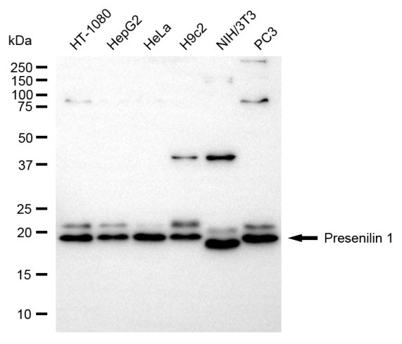Western blotting analysis using presenilin 1 antibody. Total cell lysates (30 μg) from various cell lines were loaded and separated by SDS-PAGE. The blot was incubated with presenilin 1 antibody and HRP-conjugated goat anti-rabbit secondary antibody respectively.