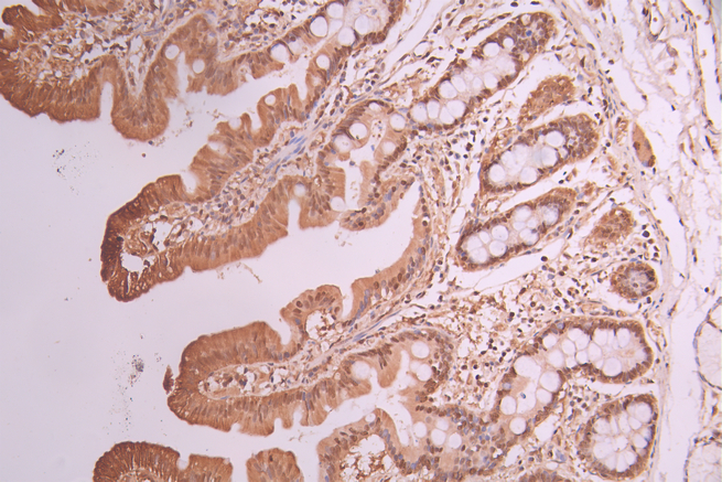 IHC image of CSB-RA276081A0HU diluted at 1:100 and staining in paraffin-embedded human small intestine tissue performed on a Leica BondTM system. After dewaxing and hydration, antigen retrieval was mediated by high pressure in a citrate buffer (pH 6.0). Section was blocked with 10% normal goat serum 30min at RT. Then primary antibody (1% BSA) was incubated at 4°C overnight. The primary is detected by a Goat anti-rabbit polymer IgG labeled by HRP and visualized using 0.05% DAB.