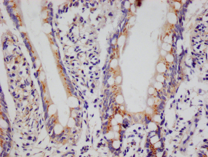 IHC image of CSB-RA943230A0HU diluted at 1:100 and staining in paraffin-embedded human small intestine tissue performed on a Leica BondTM system. After dewaxing and hydration, antigen retrieval was mediated by high pressure in a citrate buffer (pH 6.0). Section was blocked with 10% normal goat serum 30min at RT. Then primary antibody (1% BSA) was incubated at 4°C overnight. The primary is detected by a Goat anti-rabbit polymer IgG labeled by HRP and visualized using 0.05% DAB.