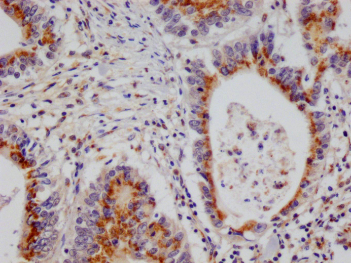 IHC image of CSB-RA943230A0HU diluted at 1:100 and staining in paraffin-embedded human colon cancer performed on a Leica BondTM system. After dewaxing and hydration, antigen retrieval was mediated by high pressure in a citrate buffer (pH 6.0). Section was blocked with 10% normal goat serum 30min at RT. Then primary antibody (1% BSA) was incubated at 4°C overnight. The primary is detected by a Goat anti-rabbit polymer IgG labeled by HRP and visualized using 0.05% DAB.