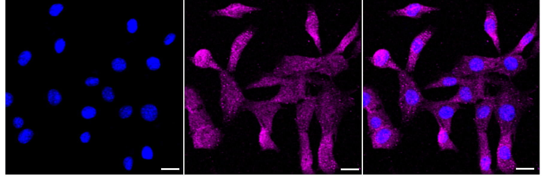 Immunocytochemical staining of C2C12 cells with Protein tyrosine kinase 2 antibody. Nuclei were stained blue with DAPI; Protein tyrosine kinase 2 was stained magenta with Alexa Fluor? 647. Images were taken using leica stellaris 5. Protein abundance based on laser intensity and smart gain: Medium. Scale bar: 20 μm.