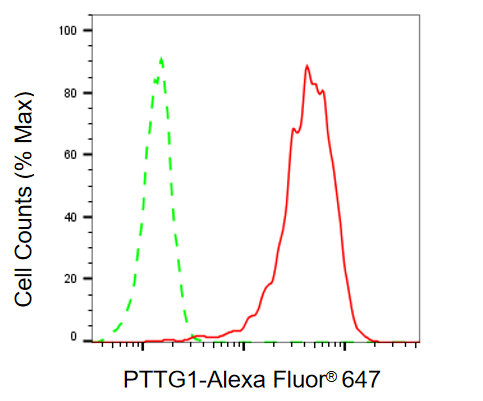 Flow cytometric analysis of PTTG1 expression in HAP-1 cells using PTTG1 antibody. Green, isotype control; red, PTTG1.