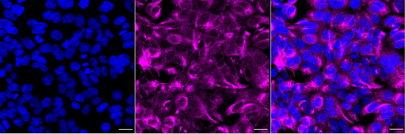 Immunocytochemical staining of HAP1 cells with PTTG1 antibody. Nuclei were stained blue with DAPI; PTTG1 was stained magenta with Alexa Fluor? 647. Images were taken using Leica stellaris 5. Protein abundance based on laser Intensity and smart gain: Medium. Scale bar, 20 μm.