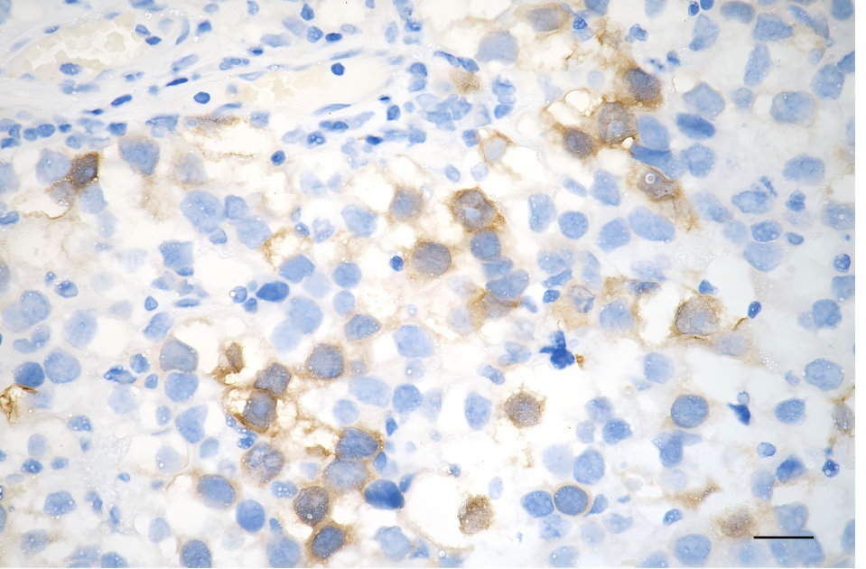 Immunohistochemistry was performed on paraffin-embedded human seminoma using PTTG1 antibody. Antigen retrieval was done in sodium citrate buffer (pH 6.0). DAB was used for detection, with hematoxylin counterstaining. Images were acquired using a Nikon Ci-L Plus microscope (40× objective). Scale bar: 25 μm.