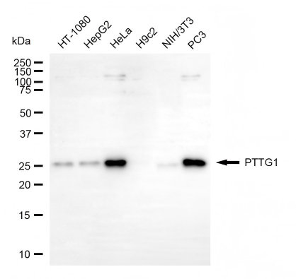 Western blotting analysis using PTTG1 antibody. Total cell lysates (30 μg) from various cell lines were loaded and separated by SDS-PAGE. The blot was incubated with PTTG1 antibody and HRP-conjugated goat anti-rabbit secondary antibody respectively.