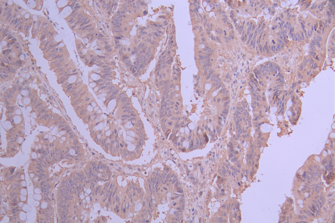 IHC image of CSB-RA090772A0HU diluted at 1:100 and staining in paraffin-embedded human colorectal cancer performed on a Leica BondTM system. After dewaxing and hydration, antigen retrieval was mediated by high pressure in a citrate buffer (pH 6.0). Section was blocked with 10% normal goat serum 30min at RT. Then primary antibody (1% BSA) was incubated at 4°C overnight. The primary is detected by a Goat anti-rabbit polymer IgG labeled by HRP and visualized using 0.05% DAB.
