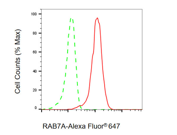 Flow cytometric analysis of RAB7A expression in H9c2 cells using RAB7A antibody. Green, isotype control; red, RAB7A.