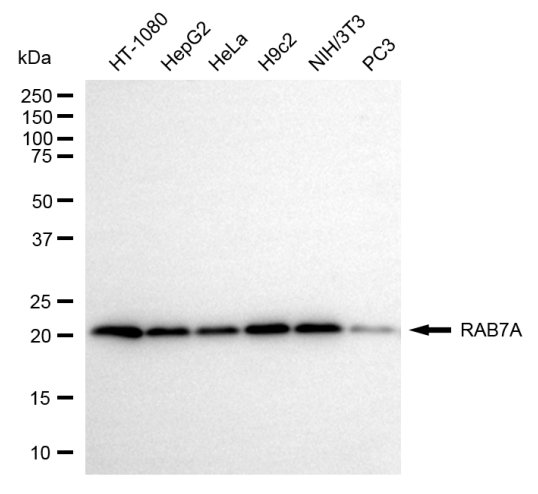 Western blotting analysis using RAB7A antibody. Total cell lysates (30 μg) from various cell lines were loaded and separated by SDS-PAGE. The blot was incubated with RAB7A antibody and HRP-conjugated goat anti-rabbit secondary antibody respectively.