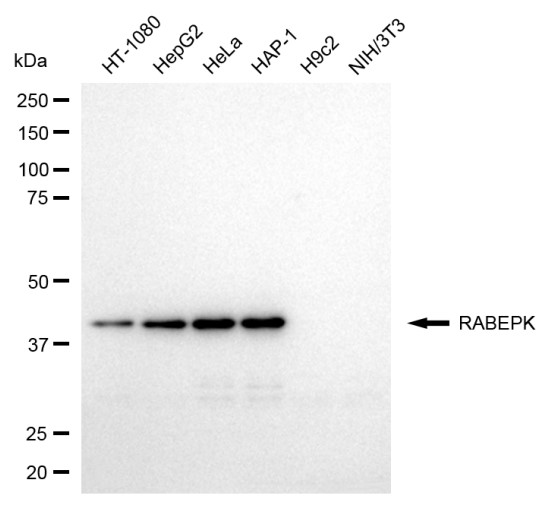 Western blotting analysis using RABEPK antibody. Total cell lysates (30 μg) from various cell lines were loaded and separated by SDS-PAGE. The blot was incubated with RABEPK antibody and HRP-conjugated goat anti-rabbit secondary antibody respectively.
