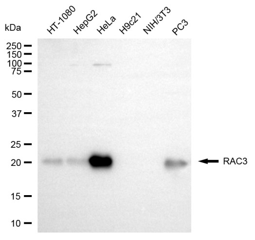 Western blotting analysis using RAC3 antibody. Total cell lysates (30 μg) from various cell lines were loaded and separated by SDS-PAGE. The blot was incubated with RAC3 antibody and HRP-conjugated goat anti-rabbit secondary antibody respectively.