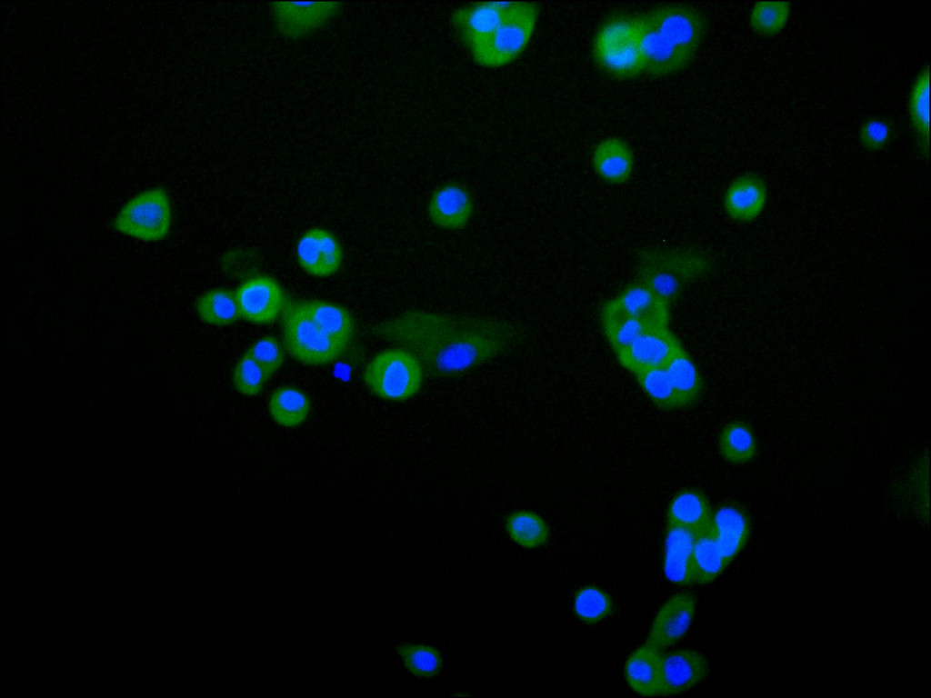Immunofluorescence staining of HepG2 cell with CSB-RA189952A0HU at 1:50 , counter-stained with DAPI. The cells were fixed in 4% formaldehyde, permeabilized using 0.2% Triton X-100 and blocked in 10% normal Goat Serum. The cells were then incubated with the antibody overnight at 4°C. The secondary antibody was Alexa Fluor 488-congugated AffiniPure Goat Anti-Rabbit IgG(H+L).