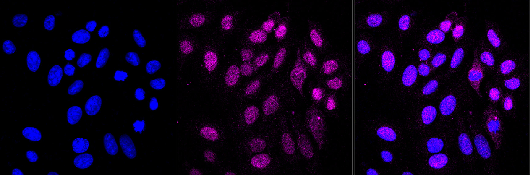 Immunocytochemical staining of HepG2 cells with RAD23A antibody. Nuclei were stained blue with DAPI; RAD23A was stained magenta with Alexa Fluor? 647. Images were taken using Leica stellaris 5. Protein abundance based on laser Intensity and smart gain: Medium. Scale bar, 20 μm.