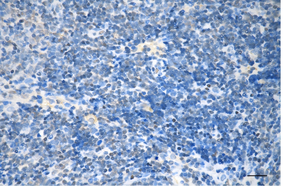 Immunohistochemistry was performed on paraffin-embedded human lymphoma using RAD23A antibody. Antigen retrieval was done in sodium citrate buffer (pH 6.0). DAB was used for detection, with hematoxylin counterstaining. Images were acquired using a Nikon Ci-L Plus microscope (40× objective). Scale bar: 25 μm.