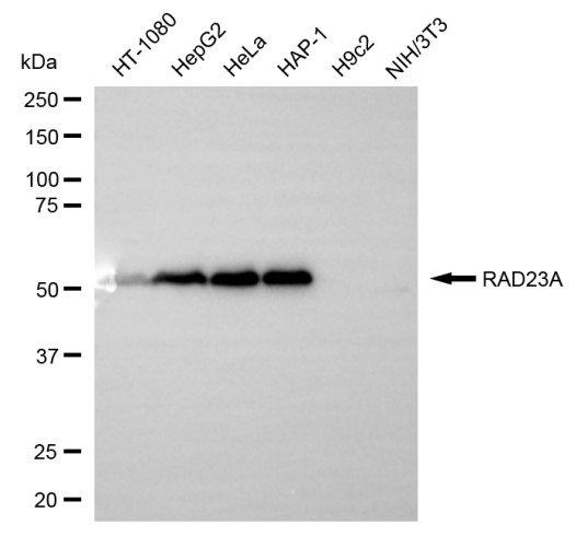 Western blotting analysis using RAD23A antibody. Total cell lysates (30 μg) from various cell lines were loaded and separated by SDS-PAGE. The blot was incubated with RAD23A antibody and HRP-conjugated goat anti-rabbit secondary antibody respectively.
