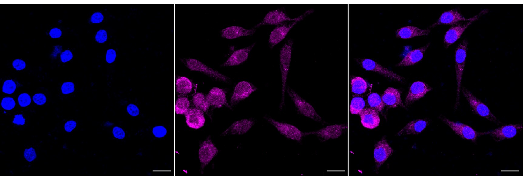 Immunocytochemical staining of Hela cells with RALBP1 antibody. Nuclei were stained blue with DAPI; RALBP1 was stained magenta with Alexa Fluor? 647. Images were taken using Leica stellaris 5. Protein abundance based on laser Intensity and smart gain: Medium. Scale bar, 20 μm.